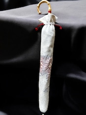 竹で作られた持ち手は、手になじんで使いやすく、ネームバンドは、共布のくるみボタンにゴールドのループを施しています。